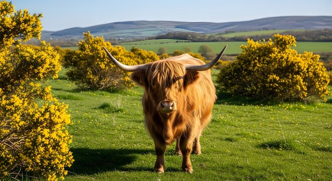 Highland cattle standing among yellow gorse bushes on a sunny day