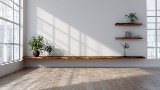 Sunlit minimal spa corner basking in warm light with long wooden bench and living wall