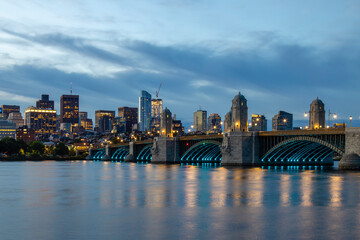 Scene of Train running over the Longfellow Bridge the charles river at the evening time, USA downtown skyline, Architecture and building with transportation concept