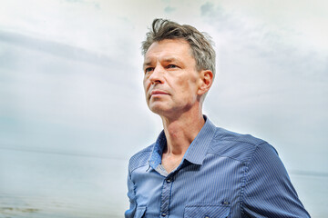 portrait of a man in a shirt near the sea. standing sideways and looking away