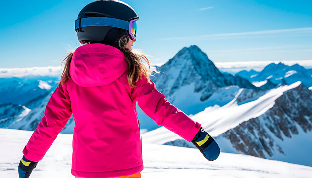 Young girl in a pink ski jacket and helmet stands on a snowy mountain, looking at the peaks in the distance. Clear blue sky and bright sunlight enhance the winter scene.