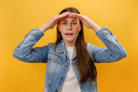 Portrait of focused young woman holding palm over her eyes, looking into distance with attentive view, watching horizon, far future concept, wearing denim jacket, isolated on yellow background wall