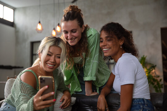 Happy diverse female friends relaxing together on bed
