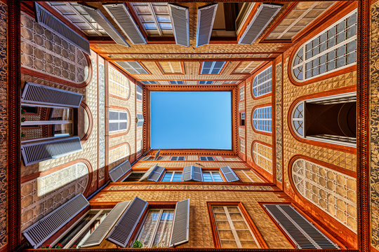 Looking up view of sky at enclosed by residential apartment medieval building decorated walls courtyard with colorful windows and opened shutters in Siena, Tuscany, Italy