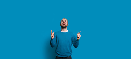 Blonde caucasian man with nice beard is pointing and looking up to the blue freespace