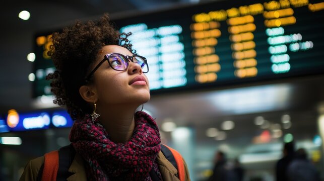 Young Woman Gazing Upwards at Departure Board in Busy Airport Terminal