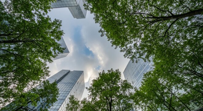 Urban lookup view of tall skyscrapers during sunset in the financial district