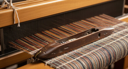 A wooden weaving loom with a shuttle resting on a striped textile, showcasing the craft of weaving.