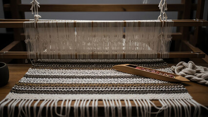 Weaving loom with wooden shuttle on rustic table in traditional workshop showing innovation and future of digital intelligence and literacy