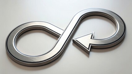 A metallic silver infinity symbol with a sharp arrow integrated, symbolizing endless continuity or perpetual motion on a light surface.