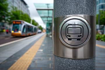 Bus route loop symbol sign on pole, urban transit wayfinding in daylight