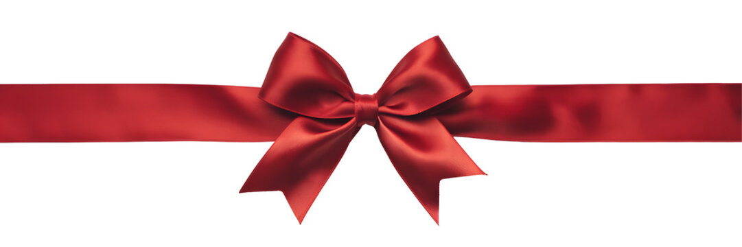 Flowing red ribbon bow with luxurious folds and graceful curves for gift wrapping or festive decoration isolated on white background