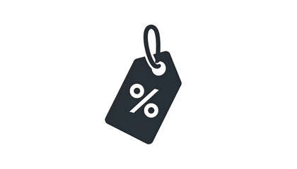 A simple black and white icon of a rectangular tag with a loop at the top, depicting a percent symbol. It is on a white background