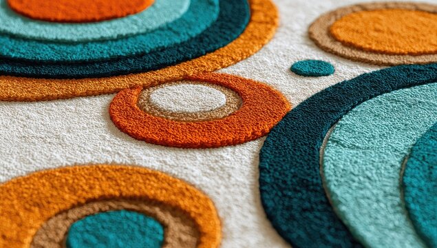 Cream colored fiber ropes are arranged in circles on a clean white background, showcasing a minimalist concept, textured details, and empty space.