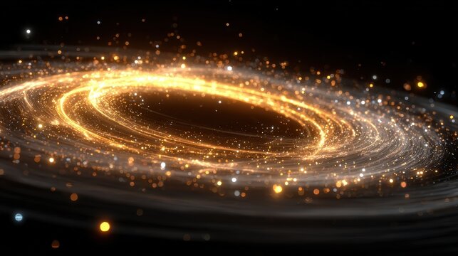 Swirling golden light forms a ring with bright particles at a dark background during a digital art creation process
