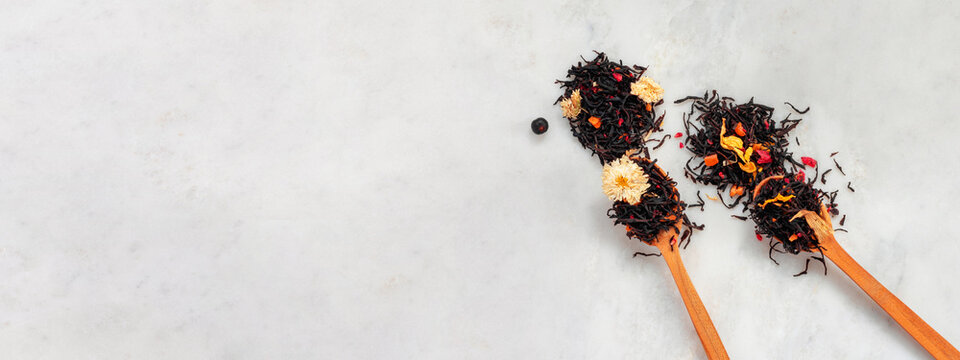 Dried black tea leaves form a rich dark texture. These aromatic long tea leaves are unfurled, ready for brewing a hot drink. Loose tea composition offers natural ingredients for herbal infusion.