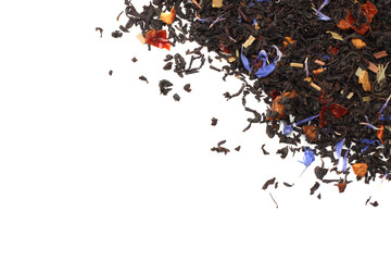 Glass cup of black tea, tea stainer and sprinkled tea leaves on dark background