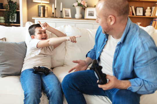 Winner vs. looser in playing video games! Happy boy having fun while celebrating his victory while playing video games against his displeased single father in the living room.