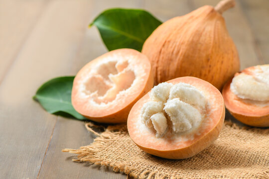 Half Santol on wood background,famous fruit of Lopburi Province. THAILAND