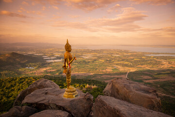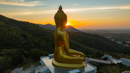 An awe-inspiring view of a big golden Buddha statue atop a hill overlooking a serene valley, captured during the vibrant colors of sunset. aerial view of The biggest golden Buddha at Lopburi Thailand