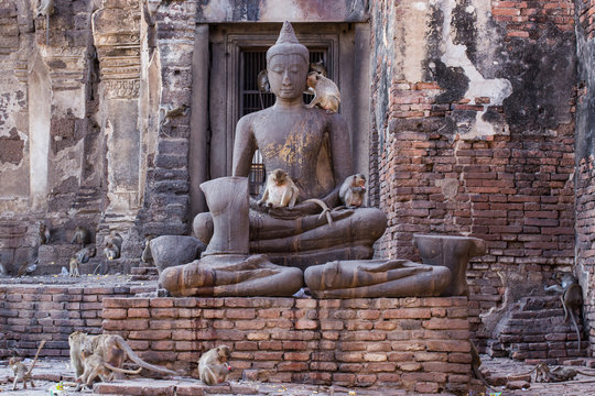 The life of long tail funny monkeys with archaeological sites. Lopburi Thailand.