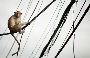 Monkey sitting on power lines in Lopburi, Thailand, Southeast Asia