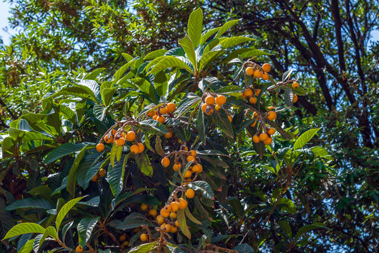 A japanese loquat tree with fruits and green leaves is in garden.