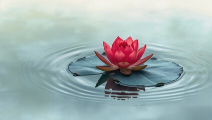 Scarlet water lily flourishing above the water with deep blue foliage, representing natural purity and aquatic flora, an emblem of spiritual peace.