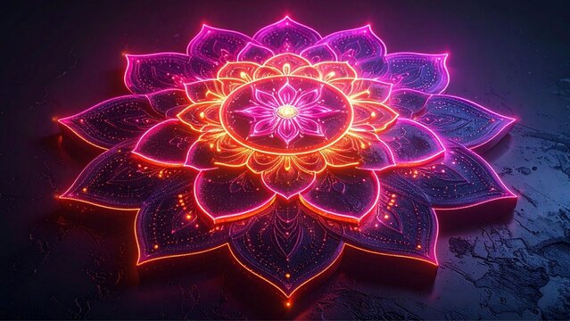 Luminous neon lotus mandala, glowing with brilliant pink and orange light, a spiritual emblem of purity and celebration, embodying the enchanting and vibrant spirit of Diwali