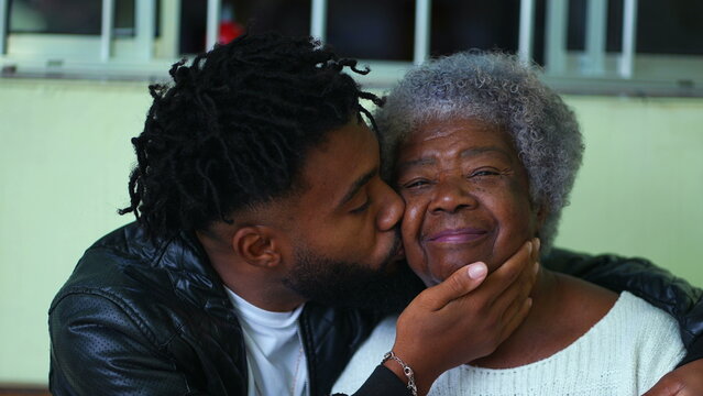 Young African American grandson in 20s kissing elderly Grandmother on the cheek in affectionate caring embrace with arms around senior member of the family, tender intergenerational bond