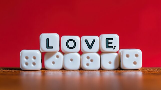 A clean, sharp close-up of white dice-like blocks arranged on a wooden surface, each block displaying one letter from the word LOVE, set against a bold red background