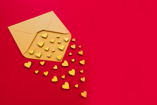 Small wooden hearts fly out of the envelope against a red background. Valentine's Day. Love concept. Gift, message for lover. Copy space.