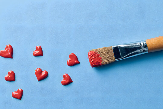 a paintbrush with red hearts on a blue surface