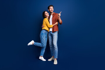 Two Young good looking asian couple using isolated on yellow background presenting to copy space feeling excited