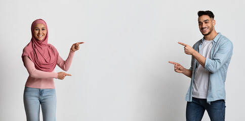 Cheerful muslim couple pointing with fingers at copy space in the middle