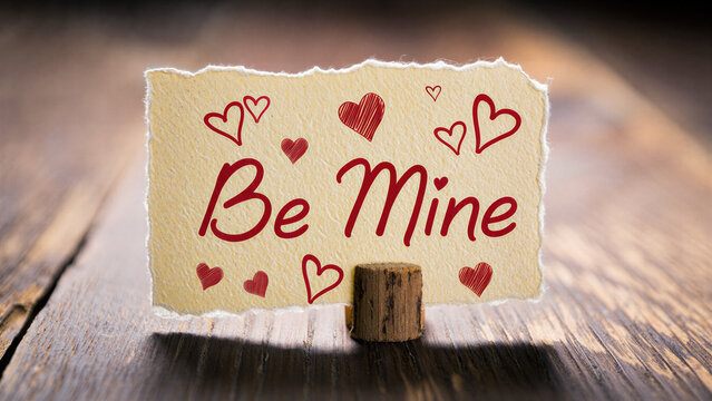 Valentine's Day card with be mine message on wooden table, romantic hearts decoration, love note background, paper texture romantic gift, february 14 celebration, heartfelt sentiment expression