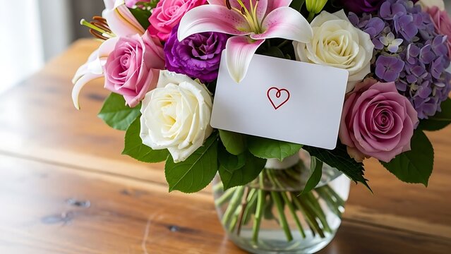 Beautiful bouquet of roses lilies and hydrangeas in glass vase with heart note