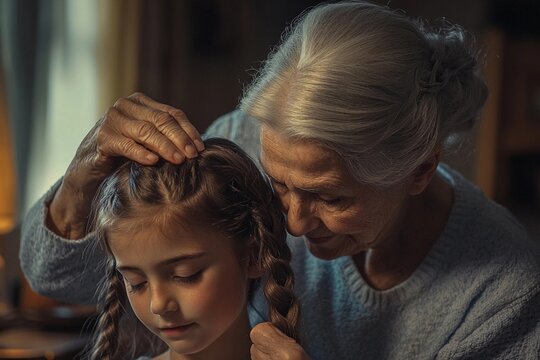 Grandmother braiding granddaughter’s hair lovingly