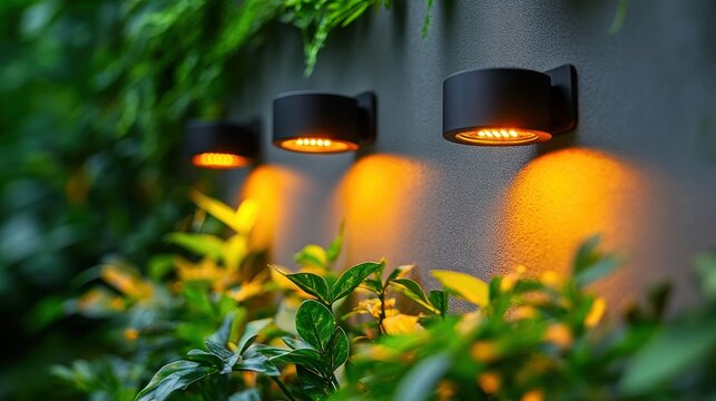 Modern outdoor wall lights illuminate greenery