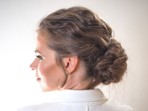 A beautiful girl gathered her wavy hair in a low bundle. Modern festive hairstyle for long brown hair. A woman braided a bunch or bun on her head on a white background. Back and side view close up
