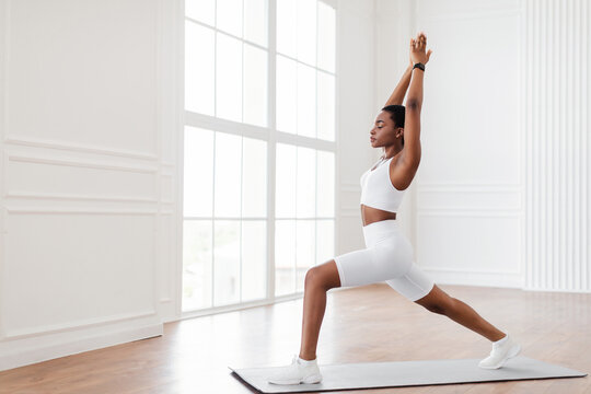 Yoga Training. Calm African American Female Standing In 1 Warrior I Or Anjaneyasana Pose On Mat, Doing Forward Lunges Raising Arms Lifting Hands Up, Training At Home Or Fitness Studio, Free Copy Space