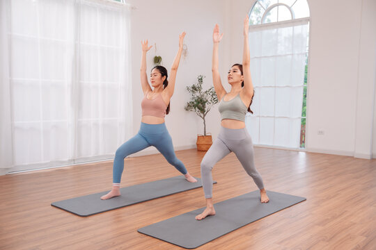 Two Asian women practicing yoga in a bright indoor studio, performing low lunge pose with raised arms, representing health, flexibility, mindfulness, and active lifestyle in peaceful setting.