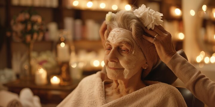 Elderly woman at a spa salon, enjoying a facial mask treatment, showcasing relaxation and happiness.