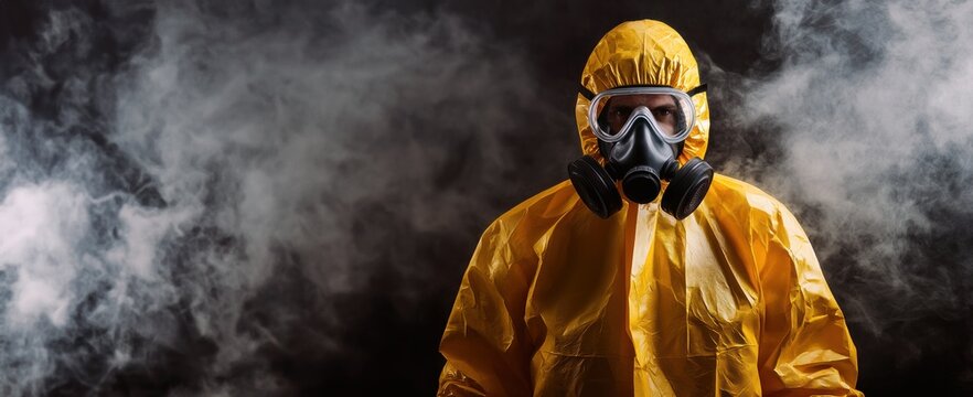 Homme en combinaison jaune de protection pour des matières toxiques portant un masque à gaz sur fond sombre avec de la fumée.
