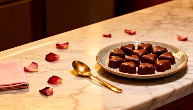 Wide shot 16:9 of a marble countertop with a ceramic plate full of artisanal heart-shaped chocolates, a gold spoon, rose petals, and a small soft-pink napkin. Warm side light creates elegant depth, lu