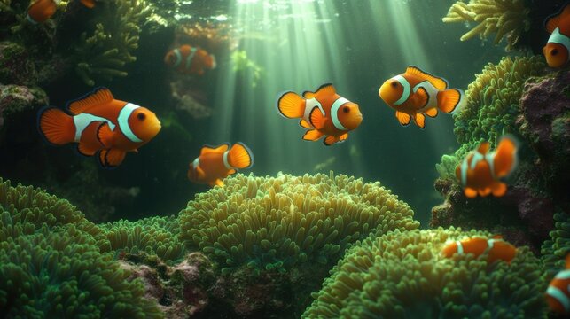 Vibrant underwater scene showcases playful orange fish amidst lu