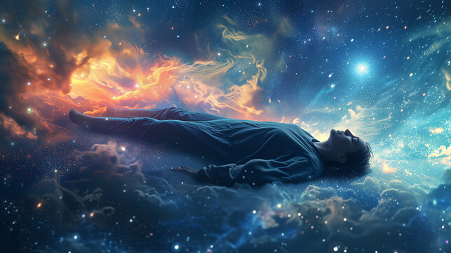 A girl in a named state of meditation, astral travel, lucid dream. Alpha, theta waves.