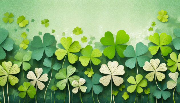 Green shamrocks background for Saint Patrick's Day, in a cut paper collage style. Generative AI