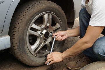 Car mechanic hand using cross wrench to uninstallation the wheel nuts for changing alloy wheel of car.