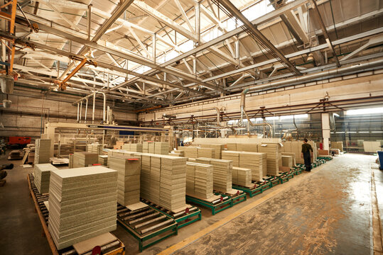Stacked lumber in the warehouse of the production site against the background of a cantilever gantry crane.